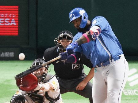 プロ野球CS。日本ハムが14安打で快勝。1点を追う3回に山県の適時三塁打、レイエス(写真)の2ラン、万波の犠飛で4点を奪い逆転。レイエスは7回にも2ランを放った。先発の北山は7回3失点=18日 【時事通信社】