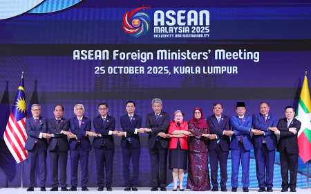 東南アジア諸国連合(ASEAN)首脳会議が26日、議長国マレーシアの首都クアラルンプールで行われる。写真は25日、クアラルンプールで記念撮影に応じるASEAN加盟国の外相ら。 【EPA時事】