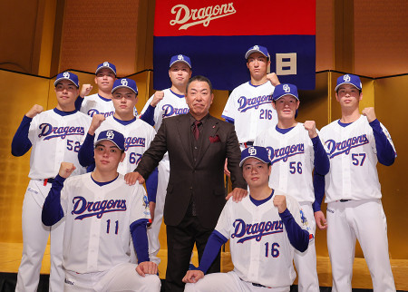 中日は10日、名古屋市内で新人9選手(育成3人含む)の入団発表を行い、ドラフト1位の中西聖輝投手(前列左)は「夢だったプロ野球のユニホームに袖を通せて、わくわくした。ここからがスタート」と笑顔で話した 【時事通信社】
