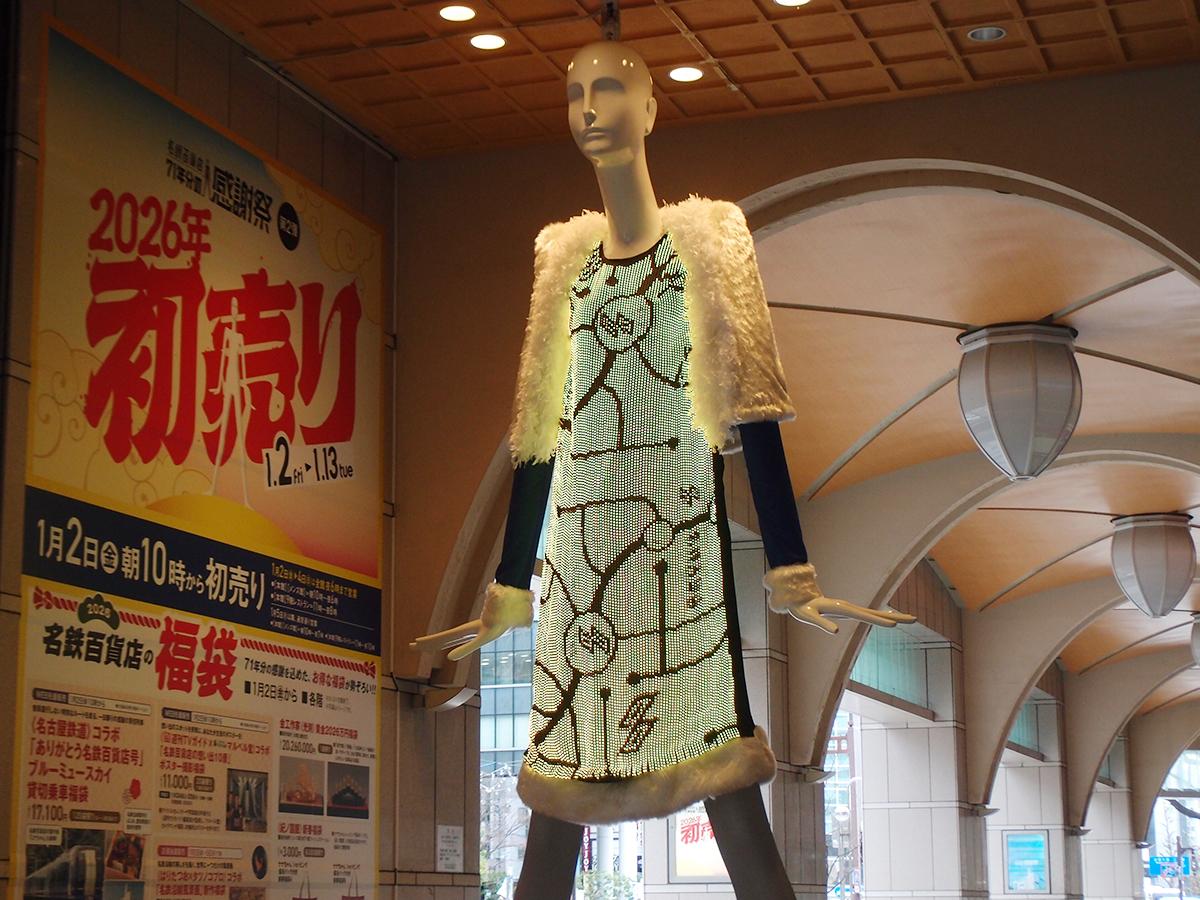 名古屋駅前の名鉄百貨店本店(名古屋市中村区名駅1)のシンボルとして親しまれている「ナナちゃん」が12月26日、7種類の同店の歴代包装紙デザインをモチーフにした衣装姿に「変身」した。
