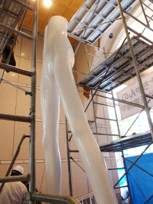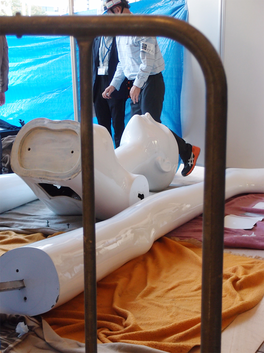 今年で37歳になる「ナナちゃん」は、身長6メートル10センチ、体重600キロ。ヘソ出しビキニの「ナナちゃん」を前に、「ここまでの露出は初めてでは」と同店広報担当者。着替え初日は晴天だったが、前日は肌寒い雨天。「昨日着せていたら怒っていたはず(笑)」。生地は東レの水着素材を使用しているため「このまま水にも入れる」とも。