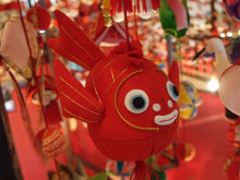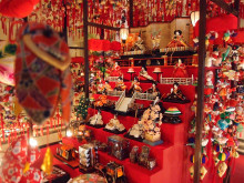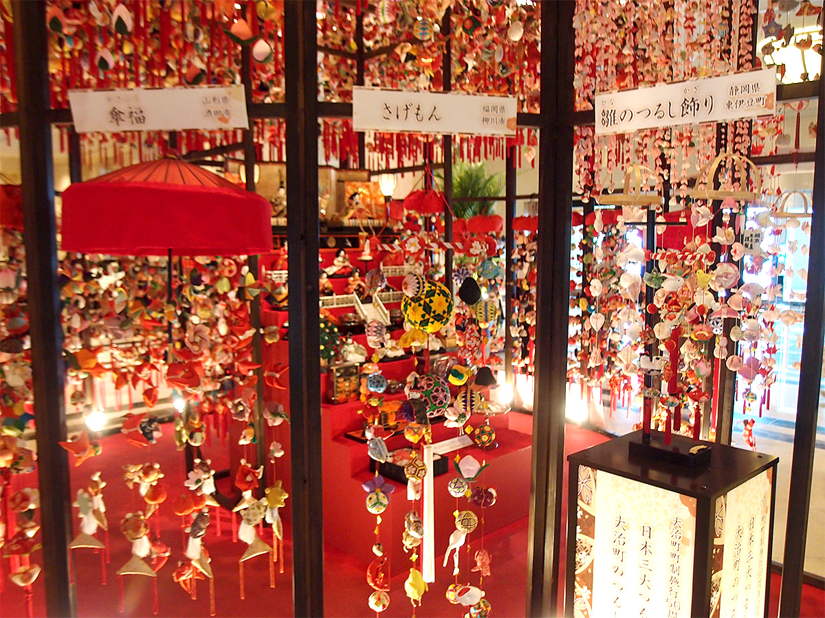 名古屋マリオットの「雛のつるし飾り」と一緒に飾られている「日本三大つるし飾り」の「雛のつるし飾り」「さげもん」「傘福」