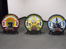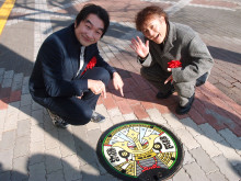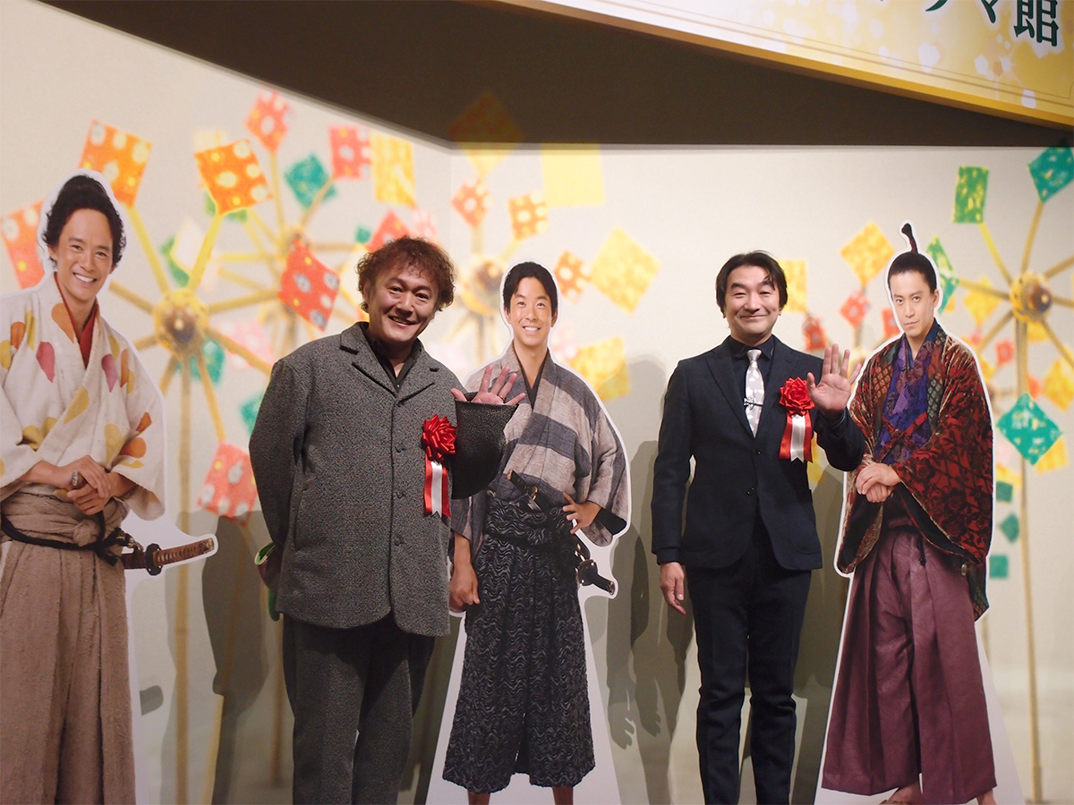 「大河ドラマ館」のキャスト全身パネル前で撮影に応える池田鉄洋さんと小林顕作さん