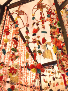 名古屋マリオットの「雛のつるし飾り」と一緒に飾られている「日本三大つるし飾り」の「雛のつるし飾り」「さげもん」「傘福」