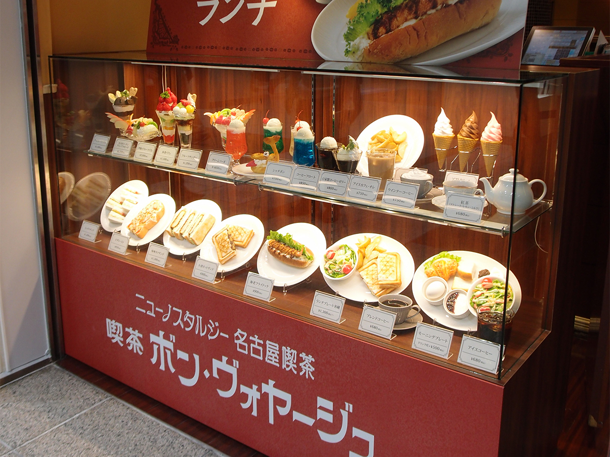 「喫茶 ボン・ヴォヤージュ」店頭には「シャチボン」をはじめとしたメニューの食品サンプルを設置