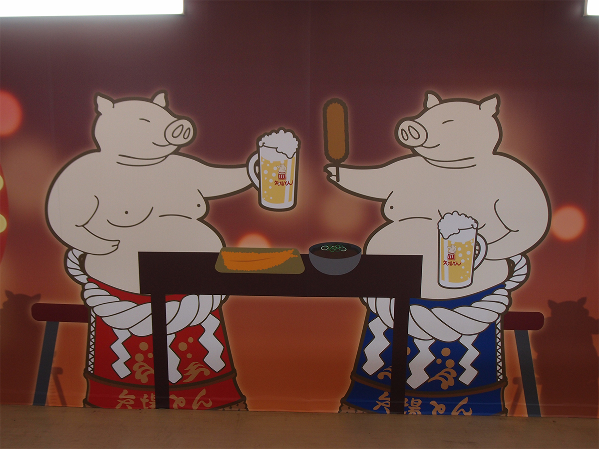 「昔の矢場とん JR名古屋駅1番線店」壁面デザインに施した創業当時の姿で少し鼻先がとがったデザインの「ぶーちゃん」