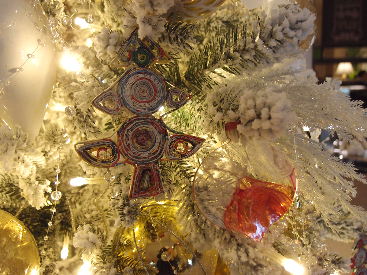 「名古屋マリオットアソシアホテル」のロビーにツリーに飾る端材や古紙を使ったオーナメント