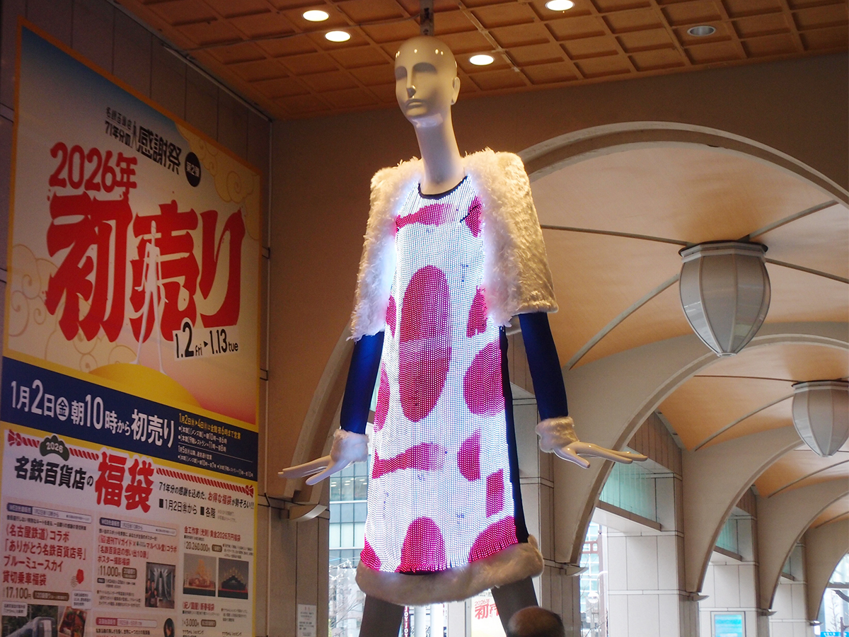 名古屋駅前の名鉄百貨店本店(名古屋市中村区名駅1)のシンボルとして親しまれている「ナナちゃん」が12月26日、7種類の同店の歴代包装紙デザインをモチーフにした衣装姿に「変身」した。