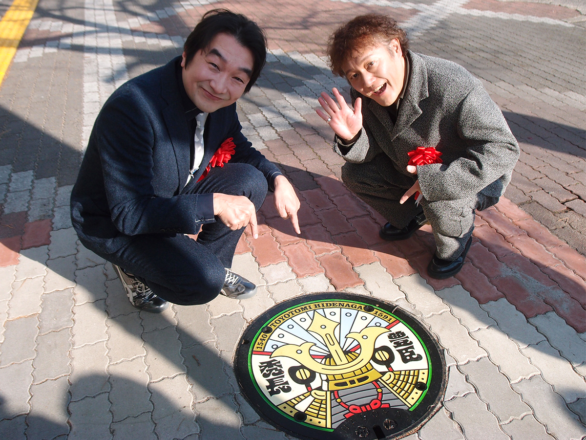 中村ゆかりの武将をデザインしたマンホールを見学した池田鉄洋さんと小林顕作さん