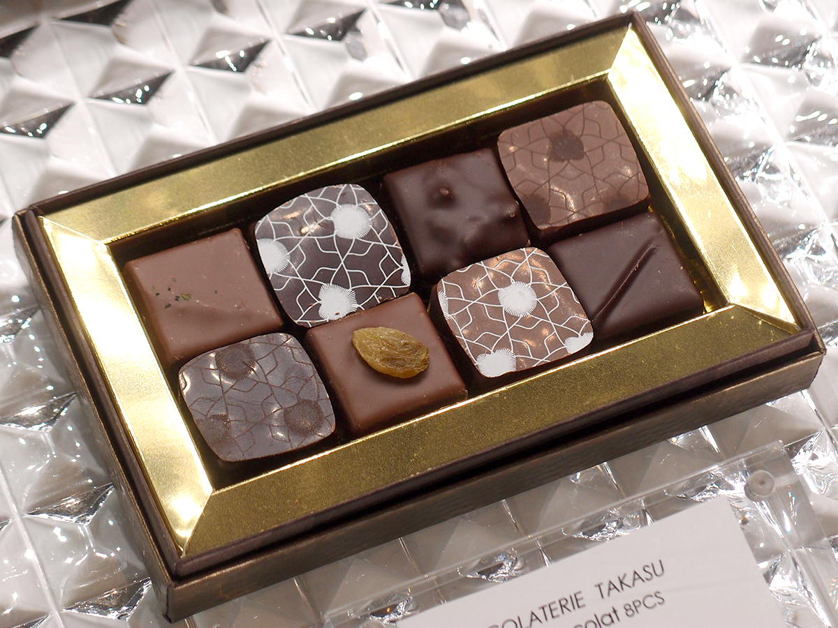 「ショコラトリータカス」の高須聡さんが手がけた「ボンボンショコラ」。味は抹茶、バニラベリー、ニブ、塩キャラメル、蜂蜜、ラムレーズン、カルダモン、ほうじ茶の全8種