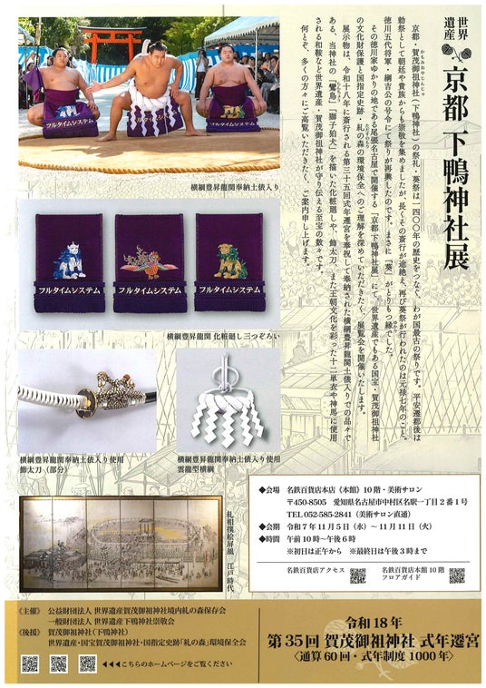 江戸初期、糺河原で興行された勧進相撲は「京都相撲の始まり」と伝えられます。本展では、第74代横綱・豊昇龍関による奉納土俵入り(令和7年10月9日)で実際に用いられた、下鴨神社所蔵の鸞鳥・獅子・狛犬意匠による特別化粧廻しや関連資料を、名古屋で特別公開。下鴨神社における相撲文化の淵源と、現代の奉納がつながる“瞬間の記憶”をご覧いただけます。