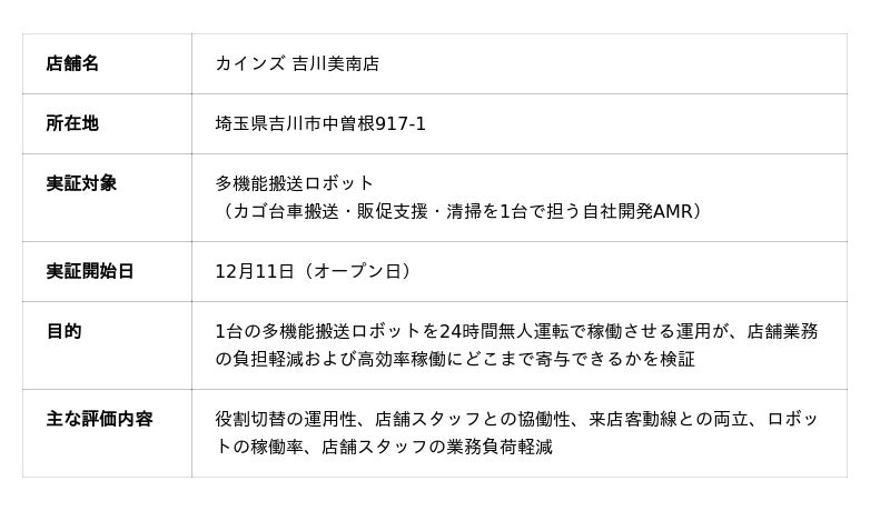株式会社FUJI(本社:愛知県知立市、代表取締役社長:五十棲丈二、以下、「FUJI」)は、株式会社カインズ(本部:埼玉県本庄市、代表取締役社長CEO:高家 正行)が様々な施策を盛り込んだ次世代型店舗として12月11日に新規オープンした「カインズ 吉川美南店」において、FUJIが開発を進める多機能搬送ロボットを用いた24時間無人運転の実証運用を開始します。今回の実証運用では、同社複数店舗で運用実績のある自社開発のカゴ台車搬送ロボットをベースに、店舗運営に欠かせない販促支援や清掃機能を追加した多機能搬送ロボットを、時間帯に応じて役割を切り替えて稼働させます。ロボット普及が進む一方で、店舗面積や人手の制約から複数ロボットの導入が難しい小売店舗の現場において、1台で複数業務を担うロボット運用が人手不足の緩和や顧客体験向上にどこまで貢献できるかを確認します。