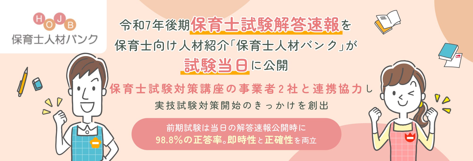 株式会社エス・エム・エス(本社:東京都港区、代表取締役社長:後藤夏樹、東証プライム、以下「当社」)は、保育士向け人材紹介「保育士人材バンク」(URL:https://hoiku.jinzaibank.com/)を提供しており、2025年10月18日(土)、19日(日)に実施される「令和7年後期保育士試験」の解答速報をサービスサイトにて試験当日に公開します。試験の受験者はLINE公式アカウントの友だち追加を行うことで、解答速報発表の通知を受け取ることが可能です。