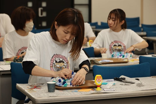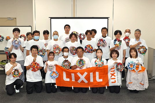 旧作業服を活用し、アップサイクルの楽しさと大切さを体験できるワークショップを実施いたしました。今年は空港事業者に加え、地元企業の株式会社LIXIL榎戸工場のみなさまにもご協力いただき、「願いのツリー」に飾る、クリスマスリースを作成しました。