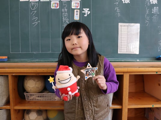 完成した星形オーナメントとなぞの旅人「フー」を持つ 筒井ひなさん