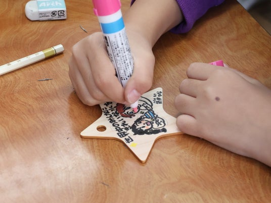 空の日(10/25)来港者にTio(ティオ)オーナメントを作成いただいている様子