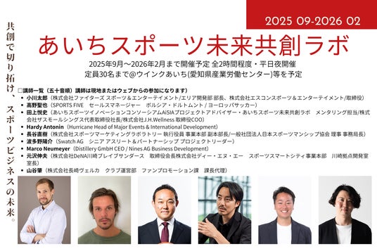 愛知県内の企業や自治体にとって、世界規模のスポーツイベント動向や先進事例に触れる機会は、自社のマーケティング戦略や地域活性化のヒントにもつながります。特にスポーツスポンサーシップをご担当の方や、新規事業としてスポーツイベントの誘致・運営を検討中の方にとって、第一線のリアルな知見を得られる貴重な機会です。本講座を通じて、世界と地域の知見をつなぎ、スポーツを起点とした新たな価値創造のインスピレーションを持ち帰っていただくことを目指します。