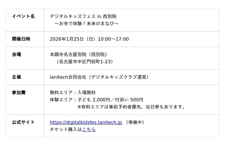「あなたと社会のテクノロジーパートナー」を掲げるlanitech合同会社(本社:東京都渋谷区、代表取締役CEO兼CTO:西脇 靖紘、以下「lanitech」)は、デジタルキッズクラブ事業にて、子ども向けデジタル教育イベント「デジタルキッズフェス in 西別院 ~お寺で体験!未来のまなび~」を、2026年1月25日(日)、本願寺名古屋別院(西別院)にて開催します。