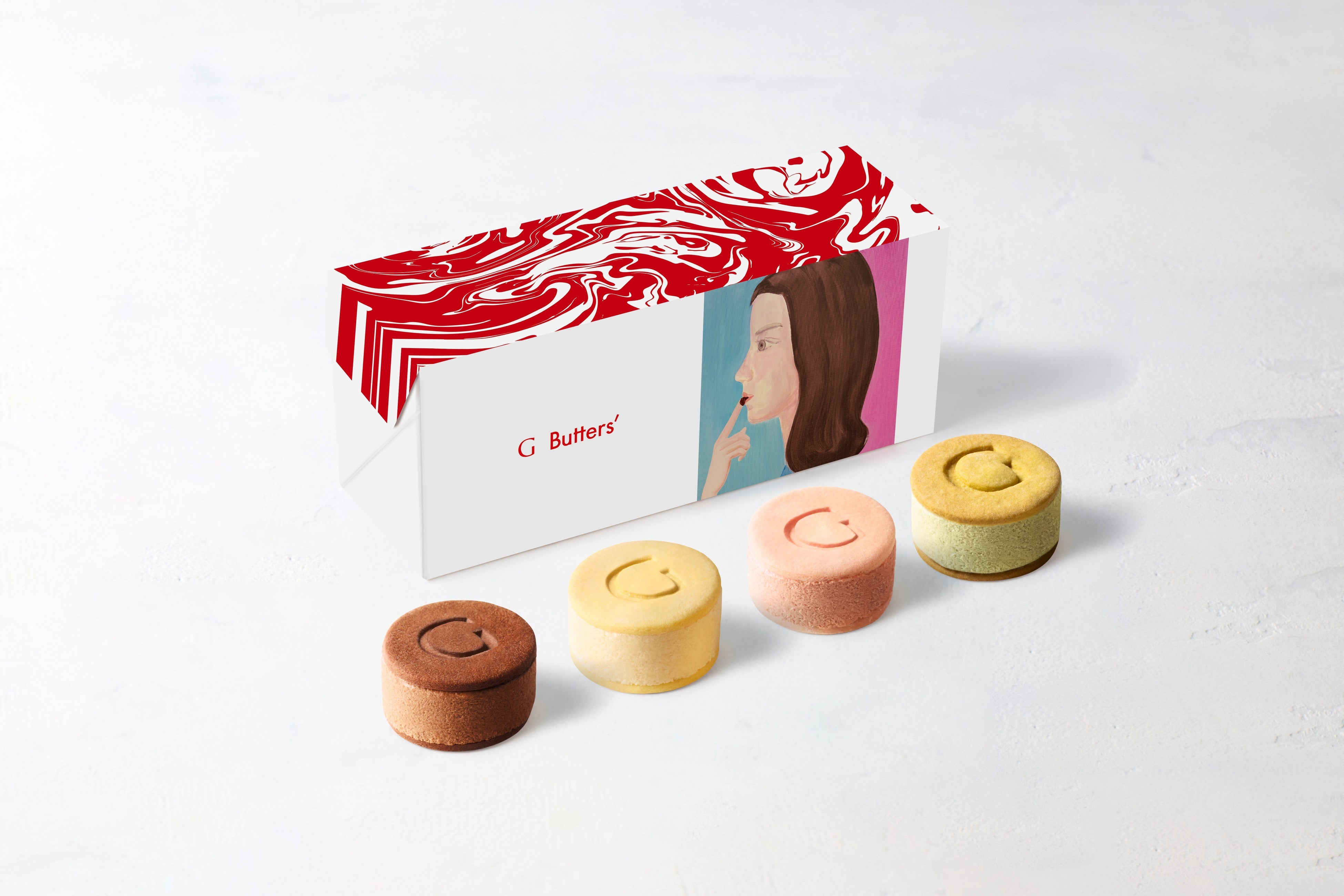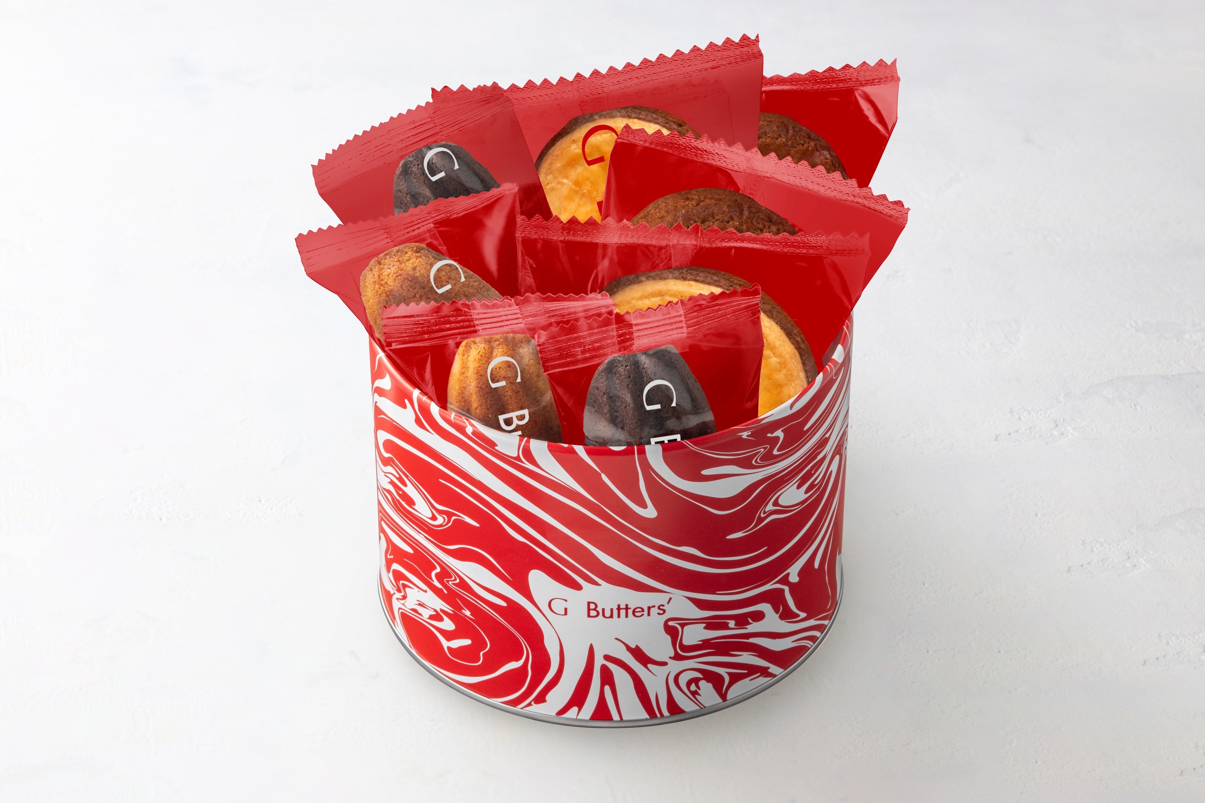 華やかな色味の缶は、Gバターズを象徴する女の子の絵をあしらいました。紅白の明るい色味に、不思議な雰囲気のデザインが、魅惑的なGバターズの世界観を表します。個包装なので、人が集まる場へのお手土産にもぴったりです。また「ガレット」、「フィナンシェ」のそれぞれのフレーバーの違いを食べ比べてみたい人にもおすすめです。