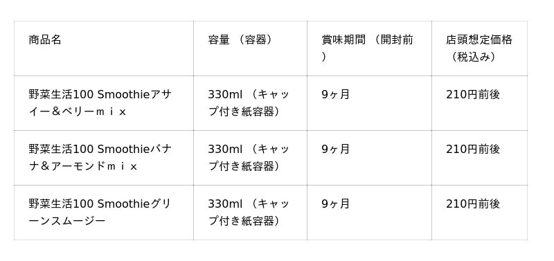 このたび発売する「野菜生活100 Smoothieアサイー&ベリーmix」は、1日分※1の鉄分を摂ることができます。口いっぱいに広がるベリーとざくろの芳醇で甘酸っぱいおいしさが特徴です。「野菜生活100 Smoothieバナナ&アーモンドmix」は、1食分の野菜※2を使用し、バナナ1本分のエネルギー※3が摂れる濃厚スムージーです。アーモンドミルク「アーモンド・ブリーズ」と同じアーモンド原料(ペースト)を使用しています。