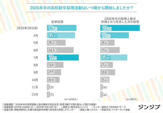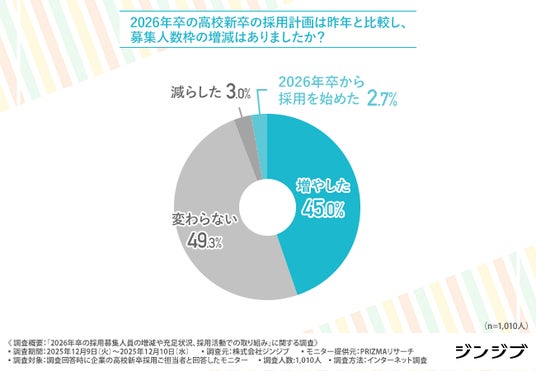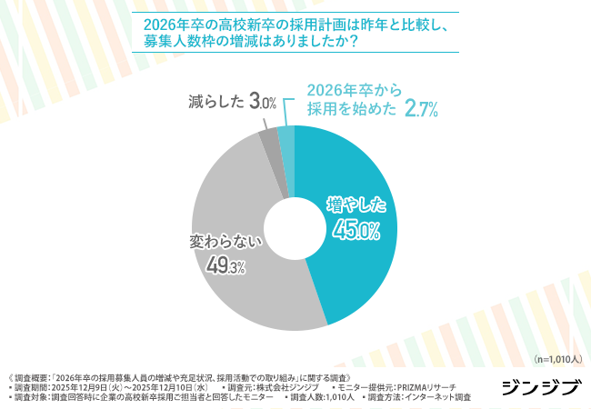 そこで、株式会社ジンジブ(https://jinjib.co.jp/)は、企業の高卒採用ご担当者を対象に「2026年卒の高卒採用の充足状況と採用活動」に関する調査を実施しました。27卒の採用活動をスタートしていくにあたり、企業の高卒採用計画の最新動向について考えます。