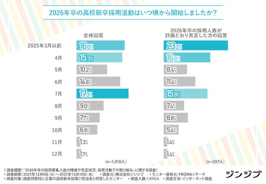 はじめに、「2026年卒の高校新卒採用活動はいつ頃から開始したか」とたずねたところ、全体回答としては『7月(17.3%)』と回答した方が最も多い一方で、通常よりも早い時期の『2025年3月以前(16.0%)』『4月(15.3%)』と続きました。また、前設問にて「2026年卒の採用人数が計画どおり充足した」と回答した方は『2025年3月以前(23.2%)』と回答した方が最も多く、『4月(16.8%)』『7月(15.8%)』となりました。