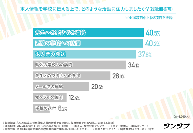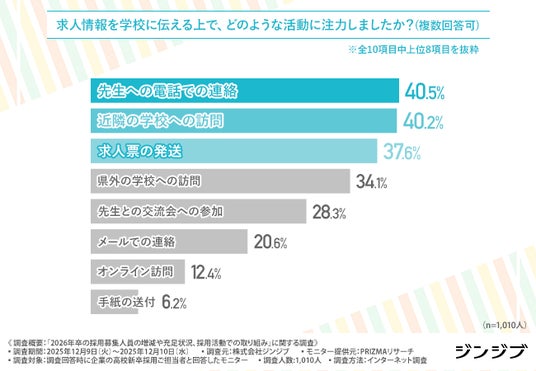 「求人情報を学校に伝える上で、どのような活動に注力したか」と質問したところ、『先生への電話での連絡(40.5%)』と回答した方が最も多く、『近隣の学校への訪問(40.2%)』『求人票の発送(37.6%)』となりました。
