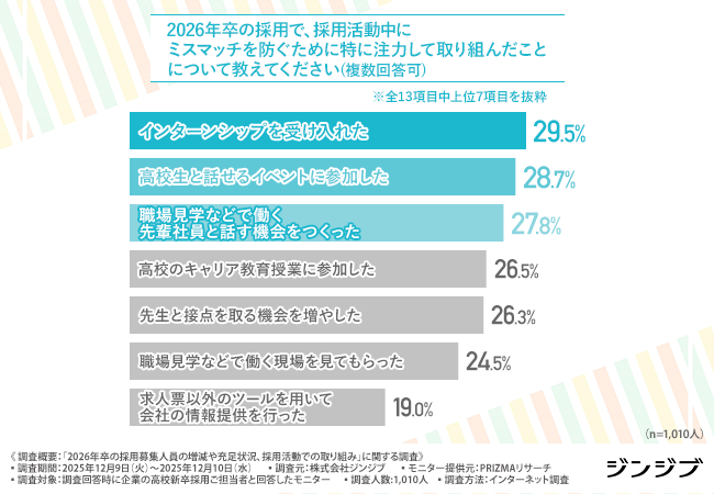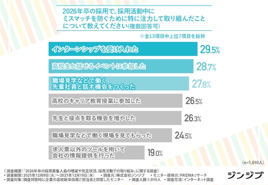 そして、「2026年卒の採用で、採用活動中にミスマッチを防ぐために特に注力して取り組んだこと」についてたずねたところ、『インターンシップを受け入れた(29.5%)』と回答した方が最も多く、『高校生と話せるイベントに参加した(28.7%)』『職場見学などで働く先輩社員と話す機会をつくった(27.8%)』となりました。