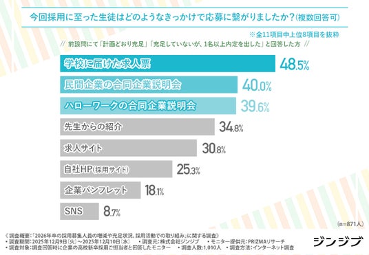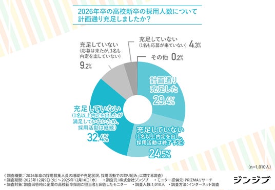 高校生の就職を支援している「ジンジブ」(大阪市)は、企業の高卒採用ご担当者を対象に「【26卒】高卒採用の充足状況と採用活動に関する調査(2025年12月)」を実施しました。