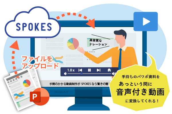 PowerPoint資料をアップロードするだけで、撮影・録音作業を行うことなく、誰でも簡単にナレーション付き動画を作成できる「SPOKES」を通じ、説明業務および情報伝達の強化と効率化に寄与いたします。