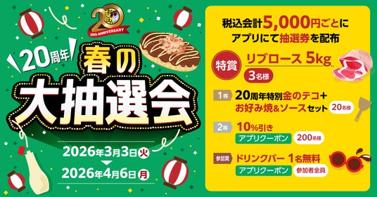 株式会社物語コーポレーション(本社:愛知県豊橋市/代表取締役社長:加藤 央之)が、全国21店舗展開中の『お好み焼本舗』(以下、おこほん)は、おかげさまで創業から20周年を迎えました。お客様の日頃のご愛顧に感謝の気持ちを込めて、2026年3月3日(火)より「20周年春の大抽選会」を実施いたします。