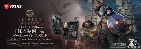 この度、エムエスアイコンピュータージャパン株式会社は、2026年3月6日(金)から2026年4月6日(月)まで、対象となるMSI X870EまたはB850マザーボードをご購入すると、『紅の砂漠』のSteamコードを無料でプレゼントいたします。