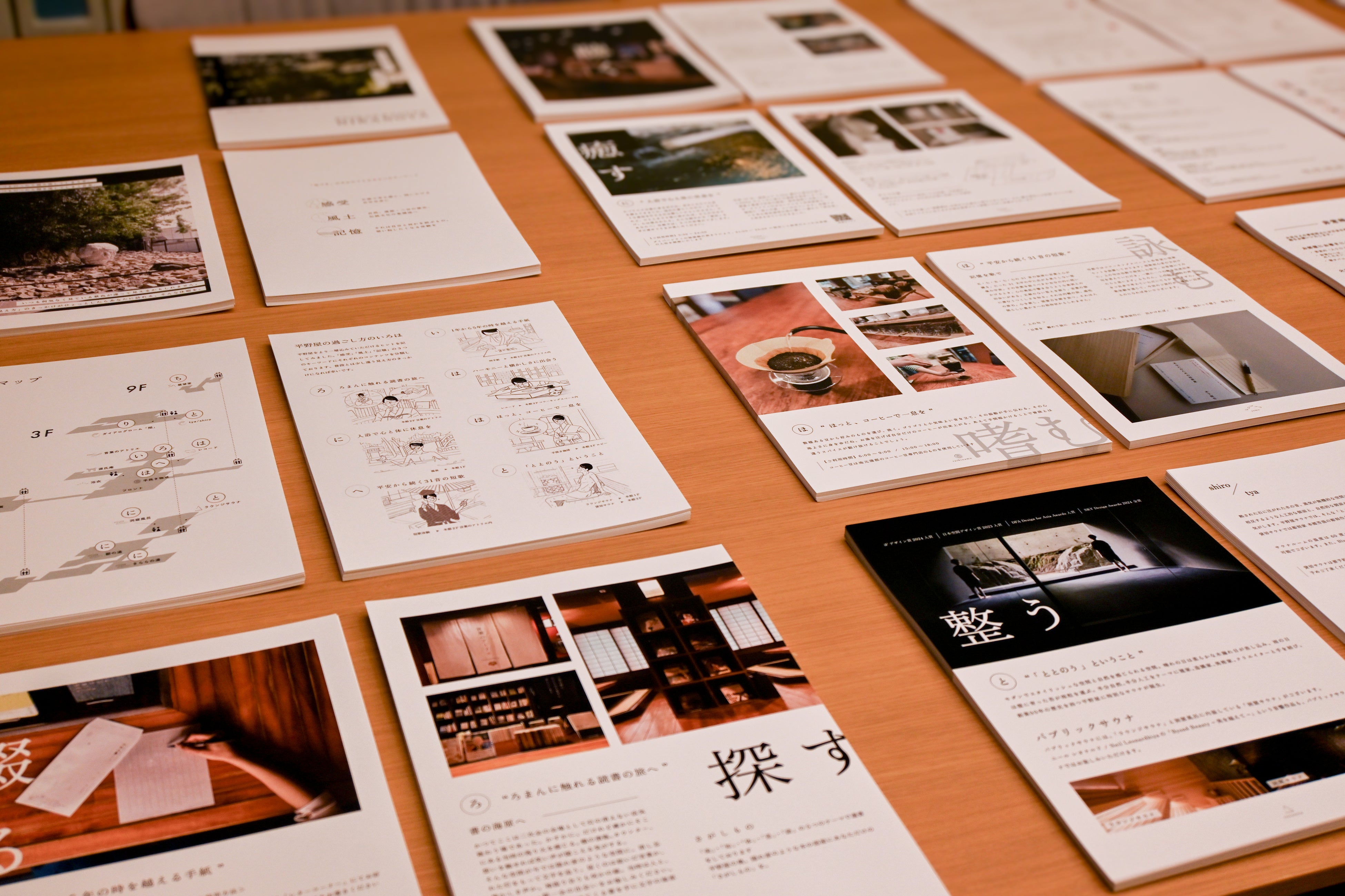 今回の共同プロジェクトでは、この思想を理念にとどめず、館内での行動や発見、滞在中の感情の流れを含めた体験として可視化することを試みています。パンフレット、館内マップ、いきもの図鑑、客室冊子などのデザインを通じて、平野屋で過ごす時間そのものの意味を形にしてきました。